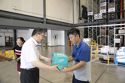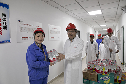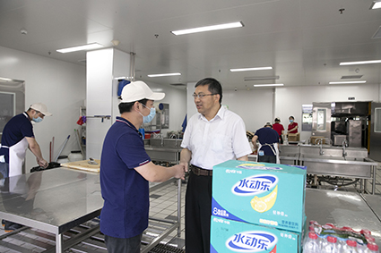 在恒广路总部,,,,,,,,公司党委副书记兼工会副主席李晓春、党委副书记兼纪委书记黄文艺、党委委员张洁陪同杨义林旅行并慰问了员工食堂、仓储中心、工程手艺中心等高温岗位。。 。。。。。